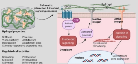聚乙二醇(PEG)基水凝膠作為可調(diào)控的三維網(wǎng)絡(luò)結(jié)構(gòu),通過其可變的理化性質(zhì)(如交聯(lián)方式)介導(dǎo)細(xì)胞與基質(zhì)的相互作用,提供動態(tài)微環(huán)境,而化學(xué)交聯(lián)(如共價鍵)增強機械穩(wěn)定性,從而觸發(fā)信號級聯(lián),調(diào)控細(xì)胞粘附、遷移及分化等行為。