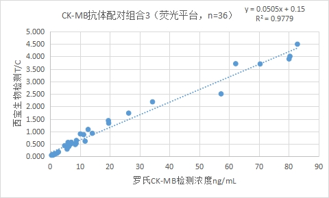 西寶生物熒光平臺CK-MB抗體配對組合3與羅氏CK-MB試劑(電化學(xué)發(fā)光法)賦值的的臨床樣本相關(guān)性R2>0.95,相關(guān)性良好;