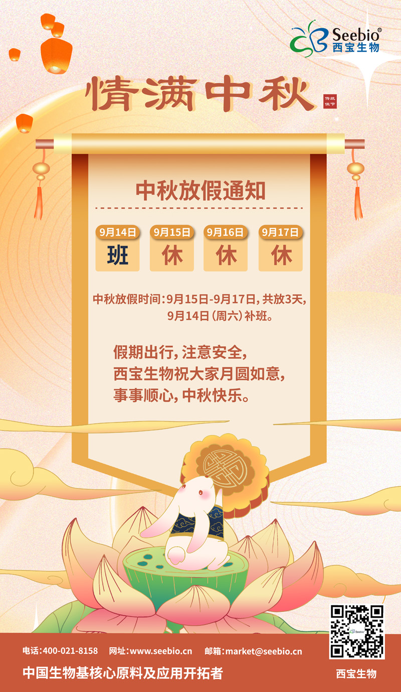 值此佳節(jié)之際,西寶生物也祝愿每一位員工,每一位客戶闔家團(tuán)圓,事事順心,中秋快樂(lè)!西寶生物中秋放假安排:9月15日-17日放假3天,9月14日調(diào)休補(bǔ)班。
