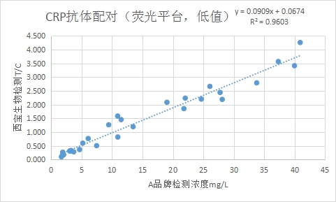 低值部分(≤40mg/L)與A品牌CRP試劑相關(guān)性R2>0.95。