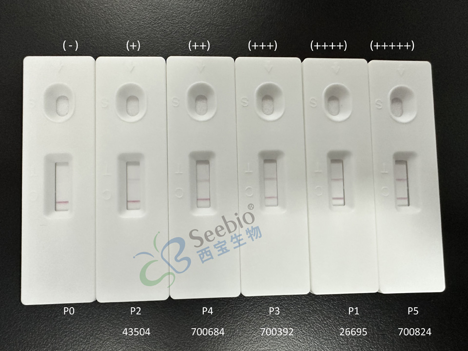 實驗結(jié)果:在彩色乳膠免疫層析平臺,采用此抗體配對組合測試稀釋后的P1-P5質(zhì)控均為陽性,表明此抗體配對測試靈敏度良好。