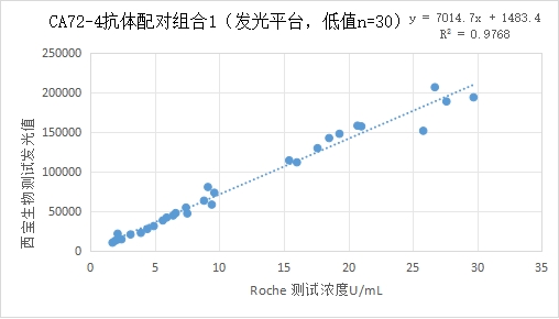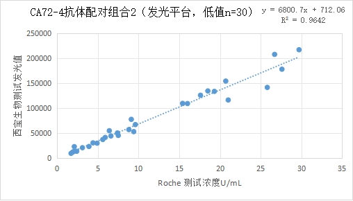 西寶CA72-4抗體配對低值部分(≤30U/mL) 的發(fā)光值與Roche CA72-4試劑臨床相關(guān)性R2>0.95;