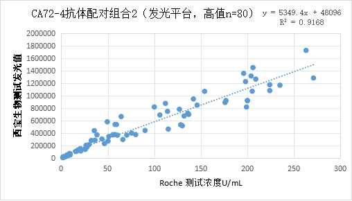西寶CA72-4抗體配對高值部分(<300U/mL)的發(fā)光值與Roche CA72-4試劑臨床相關(guān)性R2>0.90。